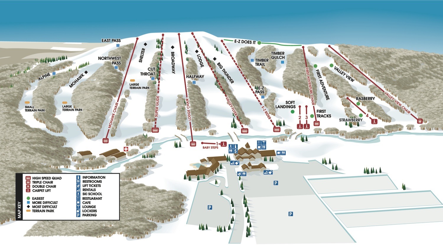 "Alpine Valley Resort is set in the beautiful Sugar Creek Valley with mature trees and rolling terrain common to the Kettle Moraine Area. Because of this, our ski hill provides diverse terrain for beginner ease, challenging expert runs and a full featured Terrain Park."